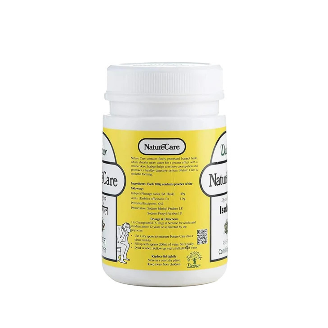 Dabur Nature Care is a powder formulation of psyllium husk (Isabgol) produced by Dabur India Ltd. which comes in 100gm which describes as a "Natural Fibre Laxative" to help with bowel regulation, gut health and constipation.